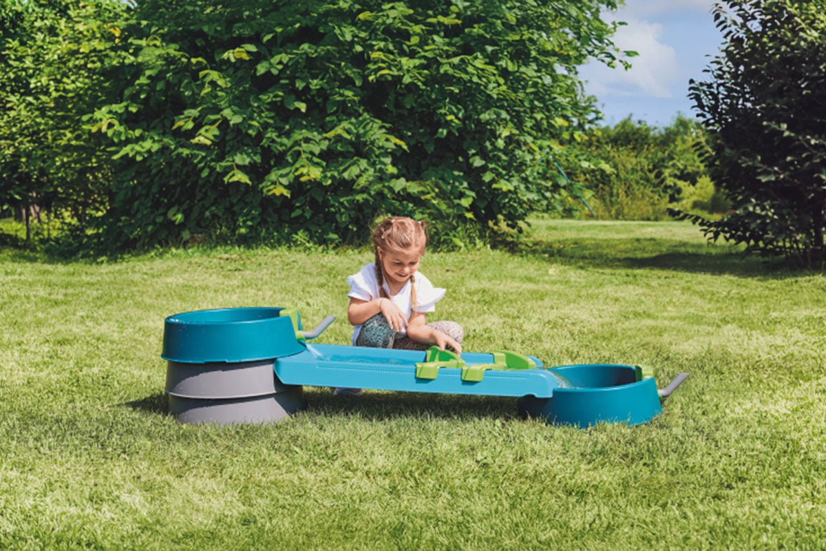 Auf rund 1,5 m fließt das Wasser wie in einem Bach durch Schleusen, Becken und drehbare Rohre. Kinder können den Wasserfluss stauen, umleiten und seine Geschwindigkeit beeinflussen. Am Ende sammelt sich das Wasser in einem Becken und wird mit der Schöpfkelle wieder nach oben transportiert – ein spannender Wasserkreislauf.