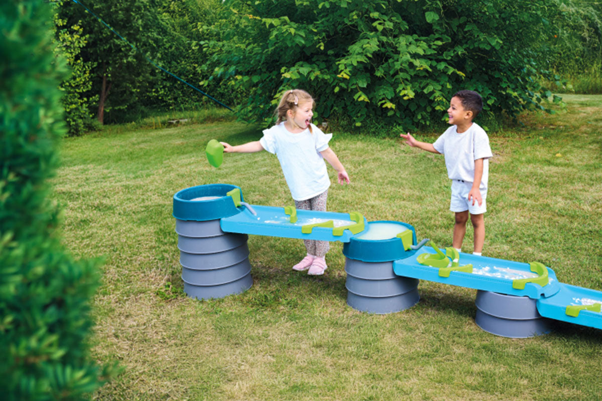 Mit dem AquaPlay Mudway Stream entdecken Kinder ab 3 Jahren auf spielerische Weise das Element Wasser und können die Eigenschaften unterschiedlicher Naturmaterialien erforschen. Die Kombination aus Wasserbahn und Sandspielsystem lädt dazu ein, Wasser, Sand, Erde und Pflanzen miteinander zu verbinden und sehen, wie Wasser Materialien bewegt oder sich seinen Weg durch diese hindurch bahnt, Hügel formt oder verschwinden lässt – ein Outdoor-Erlebnis, das fördert, fasziniert und lehrt. Auf einer Länge von drei Metern plätschert das Wasser durch mehrere Becken und Schleusen, während Kinder die Fließgeschwindigkeit und -richtung selbst bestimmen.