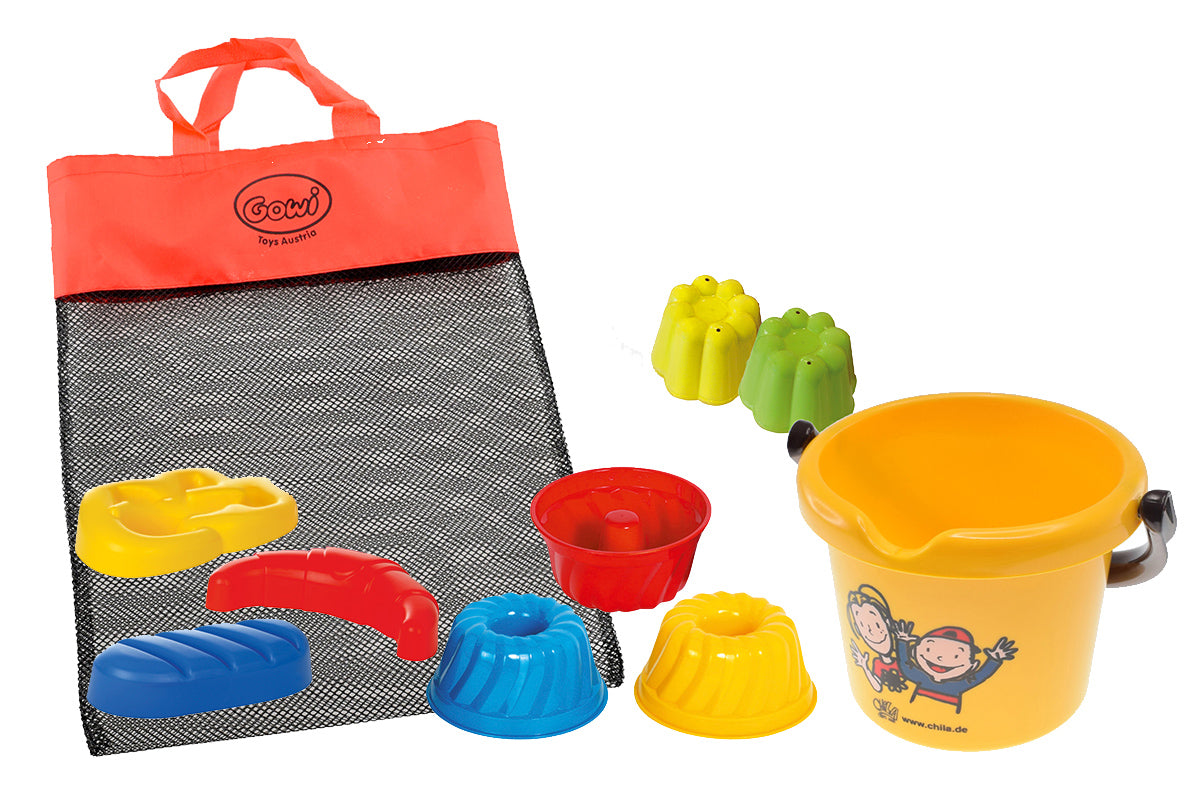 Ce kit de sable comprend trois moules à sable pour pâtisseries, un moule à sable pour gâteaux, un moule à sable pour pudding, un seau CHILA (14 cm de diamètre) et une softbox pratique !