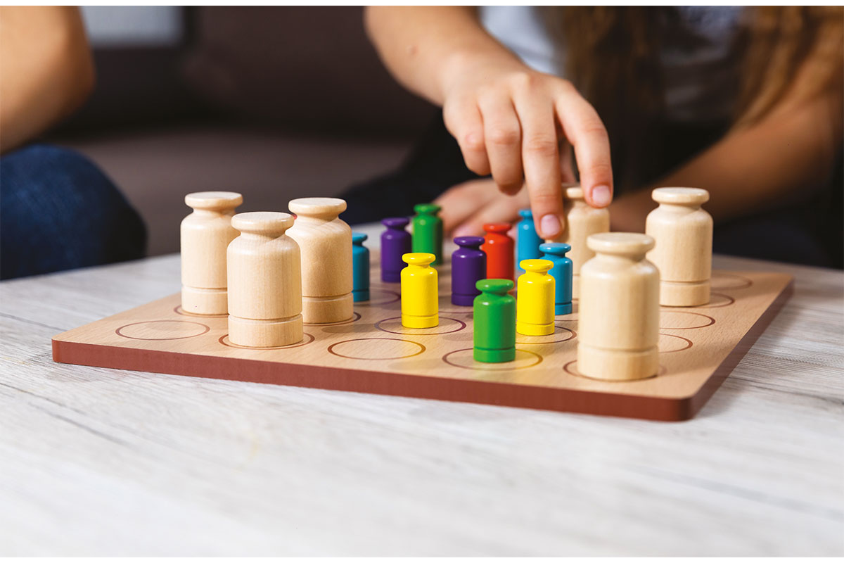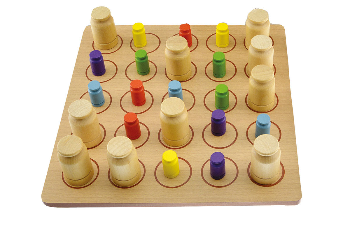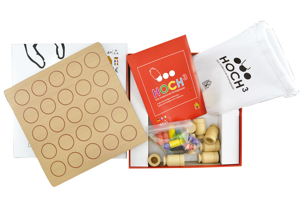 Le but du jeu est d'aligner trois petits pions de la même couleur, verticalement ou en diagonale, en les faisant glisser et en les recouvrant ! Une fois cela fait, placez les trois pions devant vous, et celui qui en a le plus à la fin gagne !