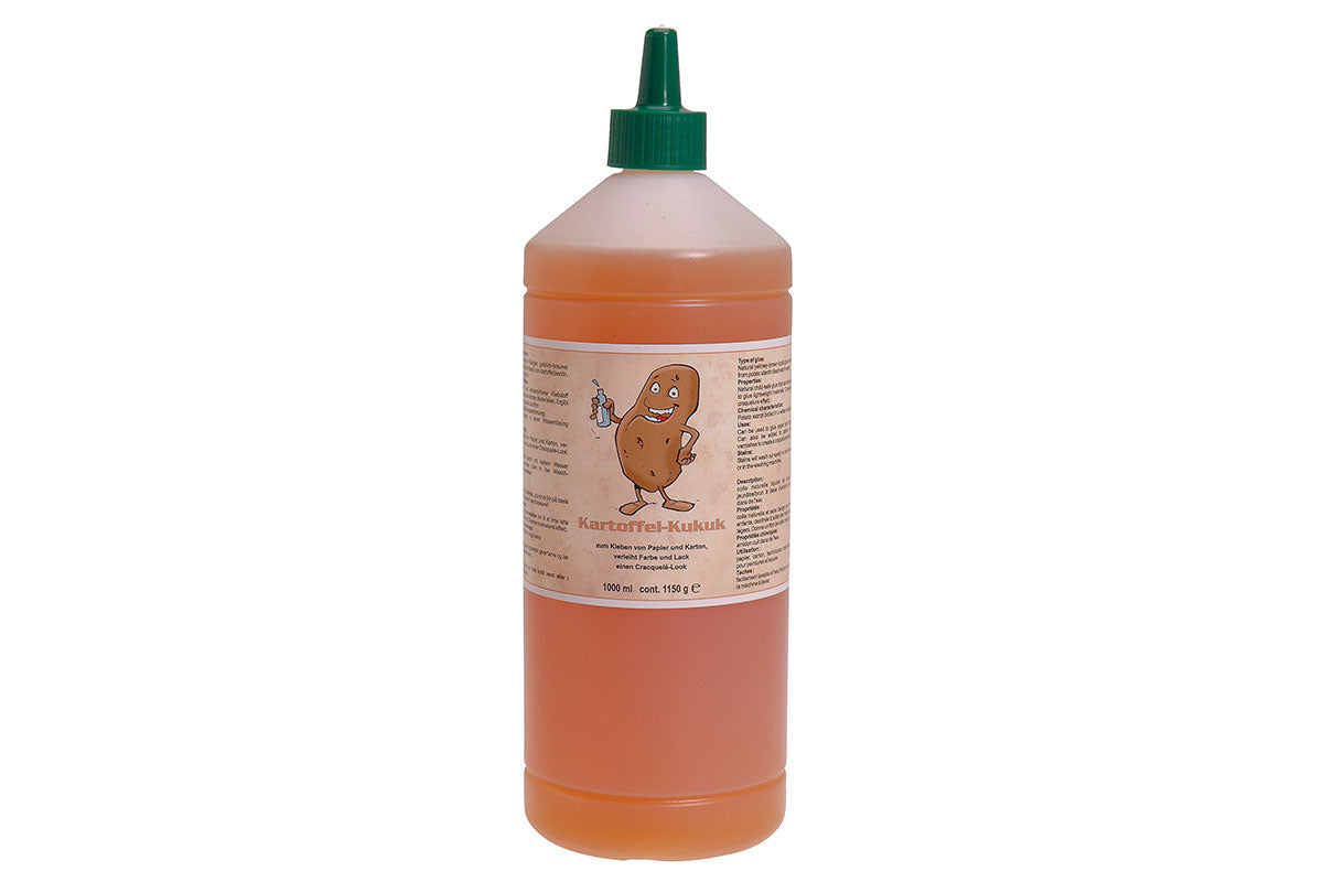 Le Potato Kukuk est un adhésif naturel, liquide, brun jaunâtre, à base de dextrine de pomme de terre dissoute dans l'eau !