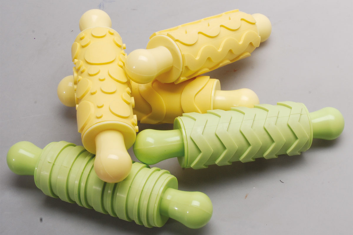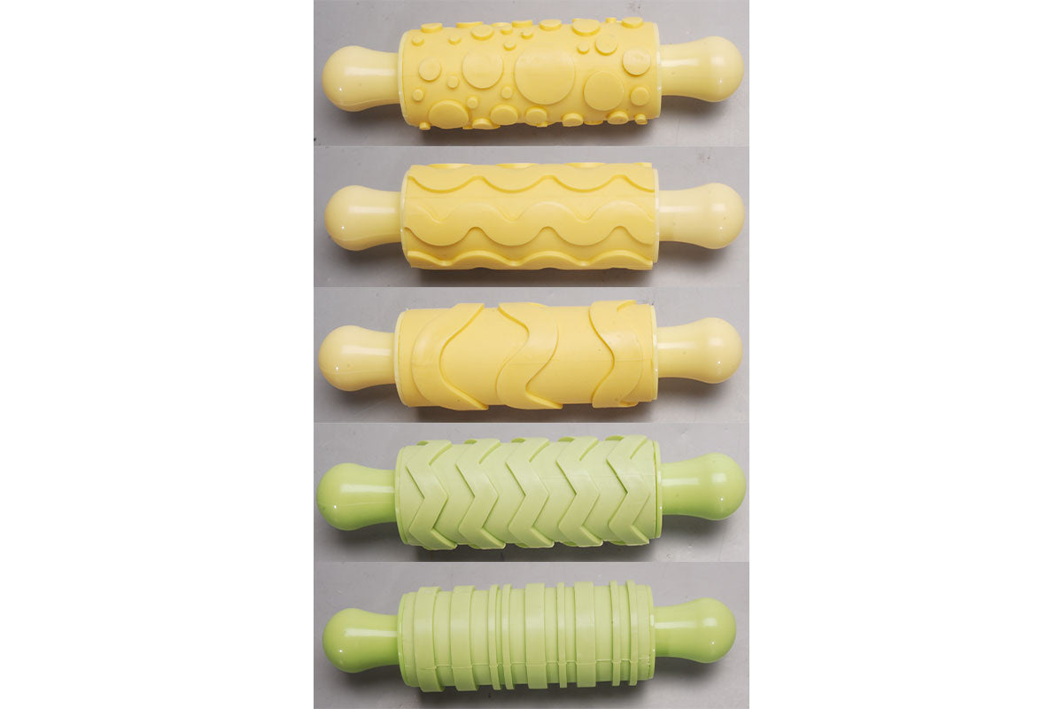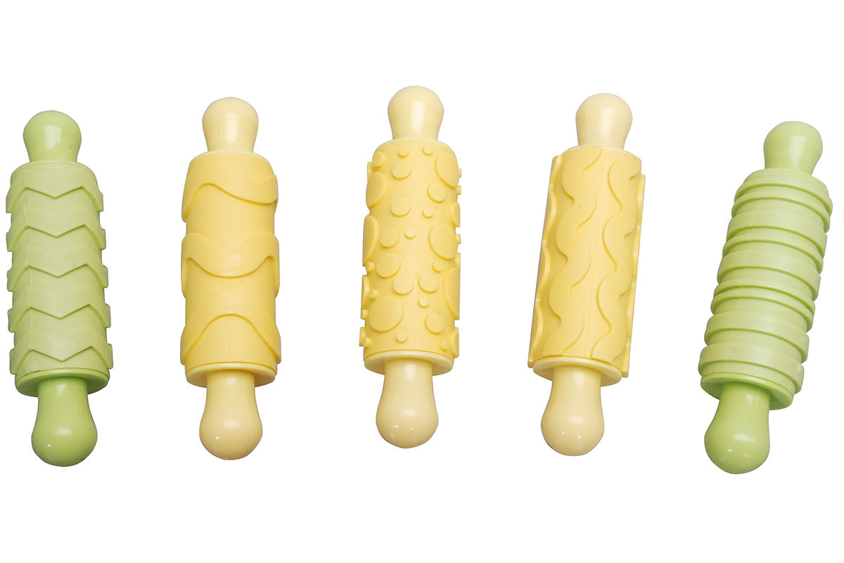 Cinq rouleaux de pâte à modeler en plastique aux motifs différents au total !