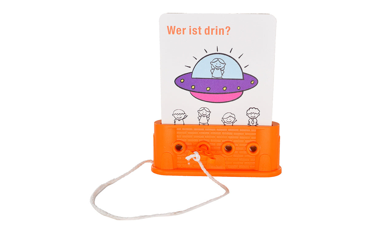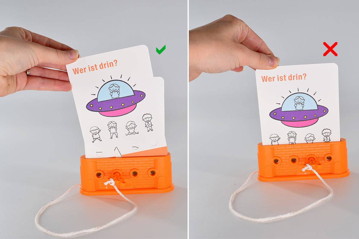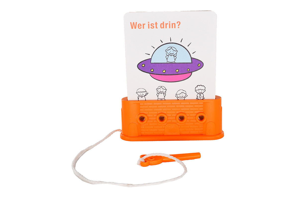 Einfaches, dennoch geniales Denkspiel: Auf den Aufgabenkarten sind verschiedene Denkaufgaben aufgedruckt. Das Kind entscheidet sich für eine Lösung und steckt den Schlüssel in das jeweilige Loch.