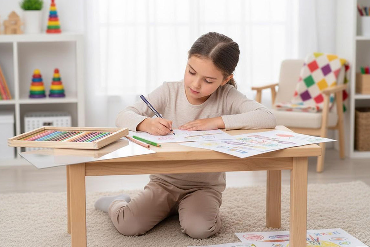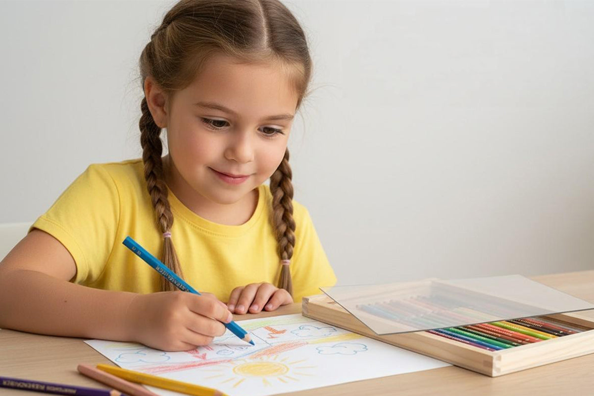 Une fois les dessins terminés, les crayons disparaissent dans leur boîte coulissante en bois, pratique et robuste, jusqu'à la prochaine utilisation.