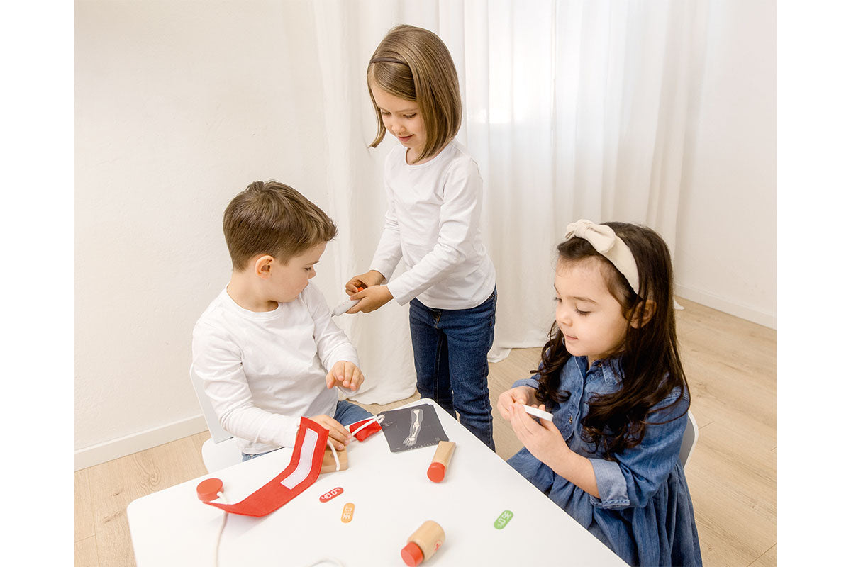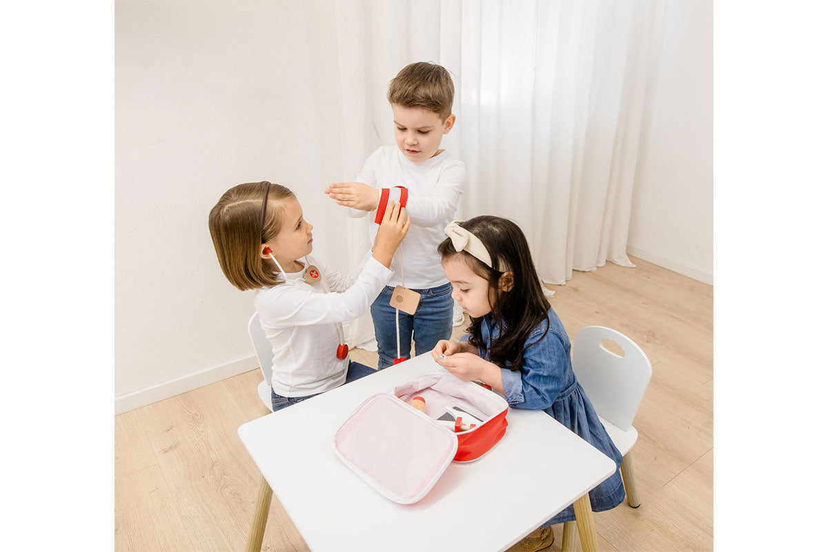 Avec le sac de jeu de rôle « Docteur », les petits apprentis médecins sont parfaitement équipés ! Ce sac pratique en coton contient des accessoires conçus avec soin et fabriqués en bois de haute qualité certifié FSC® : stéthoscope, tensiomètre, pommade, boîte à pharmacie, seringue, thermomètre, comprimés et radiographies.