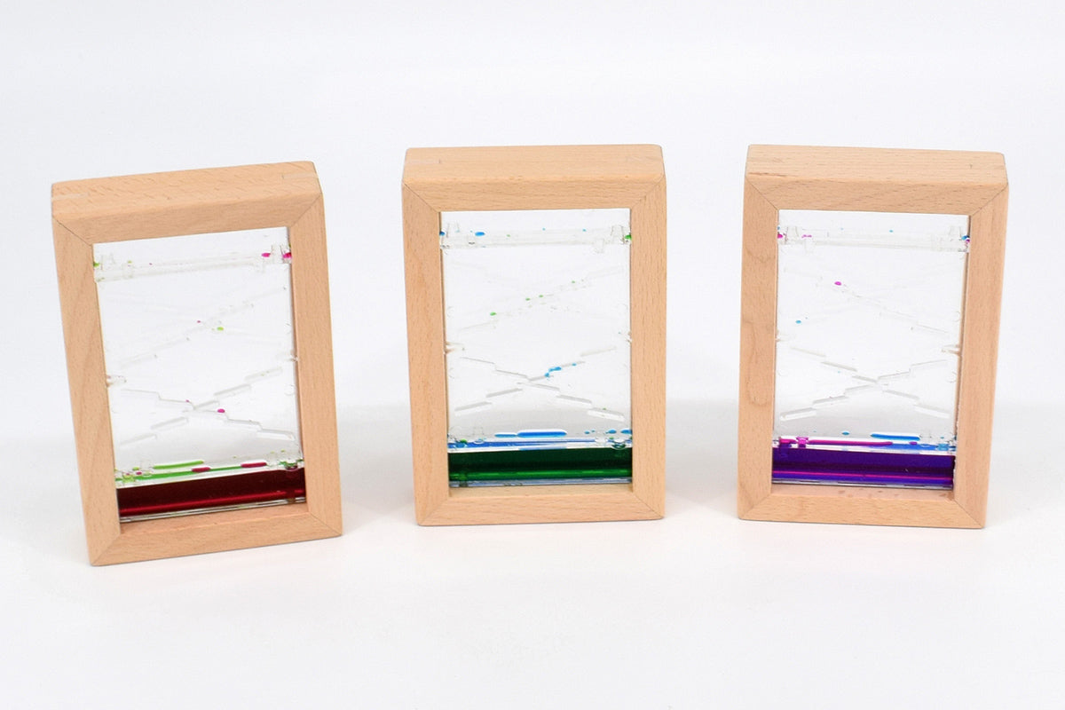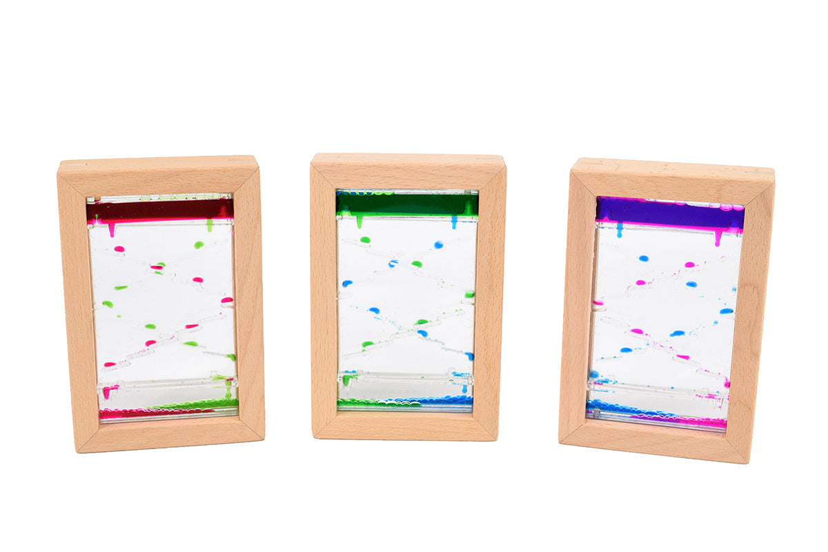 Le lent écoulement des gouttes colorées sur les petites marches crée un processus apaisant qui favorise la concentration et la relaxation. Ce sablier est idéal comme outil sensoriel au quotidien, dans un contexte éducatif, pour de courtes pauses, comme outil de concentration ou pour des séances de relaxation et de méditation. Les enfants sont captivés par le mouvement régulier des gouttes, ce qui développe leur attention, leur persévérance et leur maîtrise émotionnelle. Le cadre en bois robuste offre une agréable sensation tactile, tandis que le réservoir transparent permet d'admirer le jeu des couleurs.