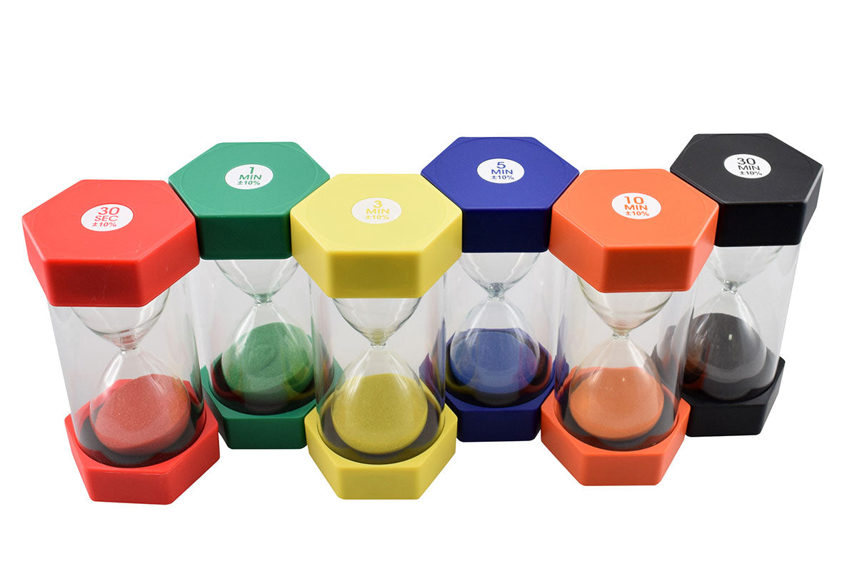 Au total, six sabliers, chacun avec une durée de 30 secondes, 1 minute, 3 minutes, 5 minutes, 10 minutes et 30 minutes !