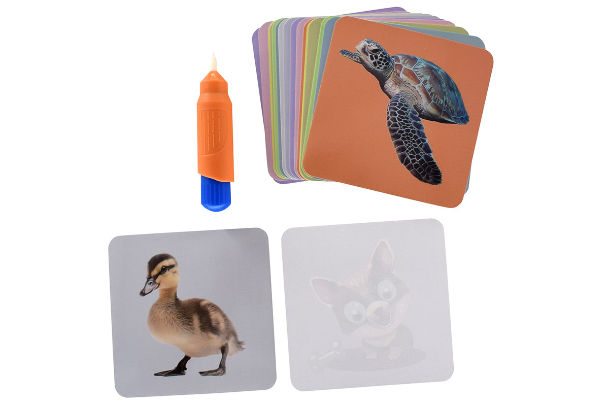Mali l'Animal est un jeu de peinture à l'eau. Le stylo à eau est rempli d'eau, on attend quelques instants que la pointe soit imbibée, puis on peut peindre. Les 18 cartes illustrées présentent une photo réaliste d'un animal d'un côté et un dessin amusant à colorier de l'autre. Dès que les cartes entrent en contact avec l'eau, de magnifiques images apparaissent. Une fois l'eau évaporée, le dessin disparaît. Et même si les enfants peignent accidentellement sur la table avec le stylo, aucune trace de couleur disgracieuse n'apparaît.